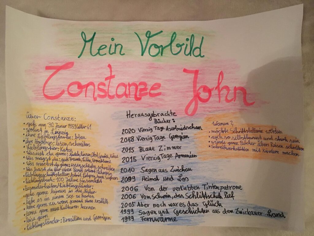 Constanze John: „Auf Anfrage führe ich für Einzelpersonen wie für Schulklassen Schreibwerkstätten durch. Diese können online oder vor Ort stattfinden. Sie buchen entweder eine meiner Schreibwerkstätten für einzelne Stunden oder für Projekttage. Weitere Details besprechen wir am besten persönlich. Kontaktieren Sie mich einfach.“